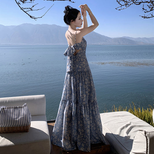 French Style Off-shoulder Backless Bow Suspender Skirt Floral Pleated