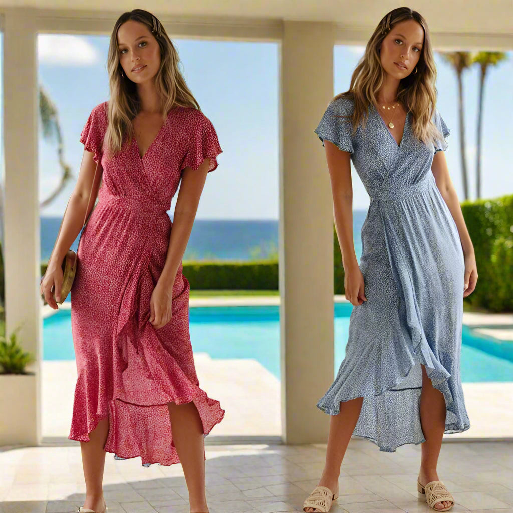 This playful floral summer dress features a flattering V-neck and breezy short sleeves, perfect for sunny days. Crafted from a soft cotton blend with 51%-70% cotton and 30%-50% acrylic, it offers comfort and a light, airy feel. Its vibrant floral pattern adds a fun, fresh touch to your warm-weather wardrobe.