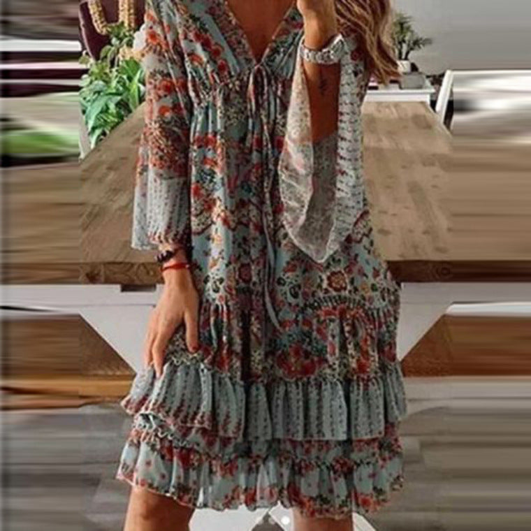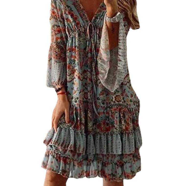 Dress Fashion Printed Cotton Mid-Waist Blue Dress