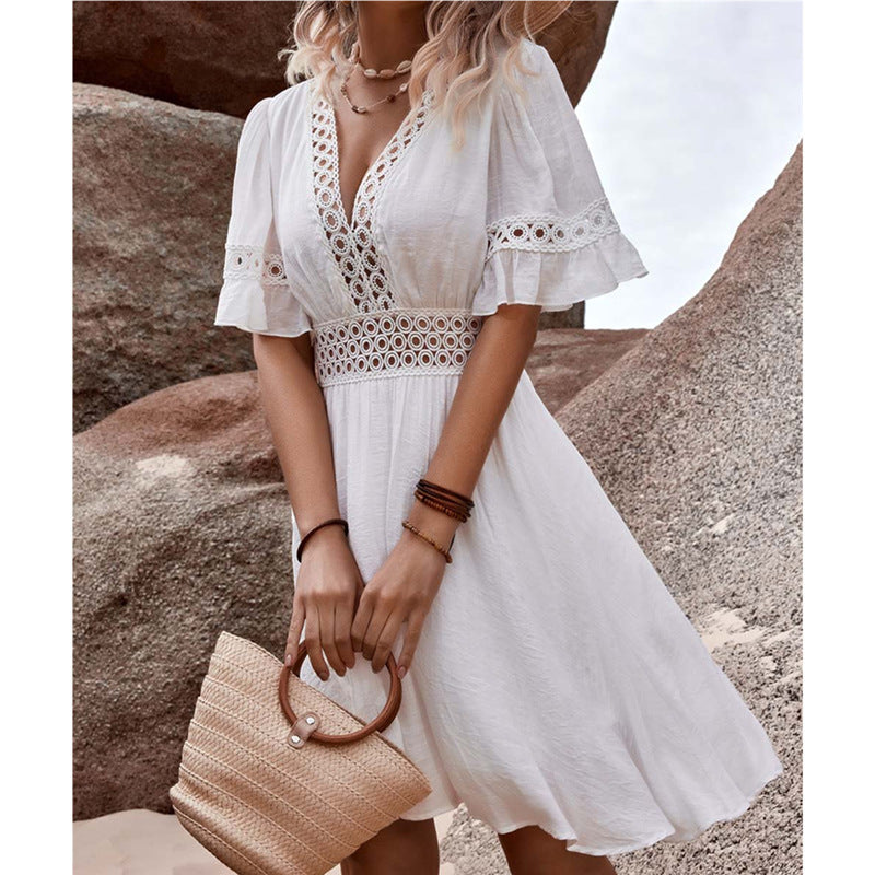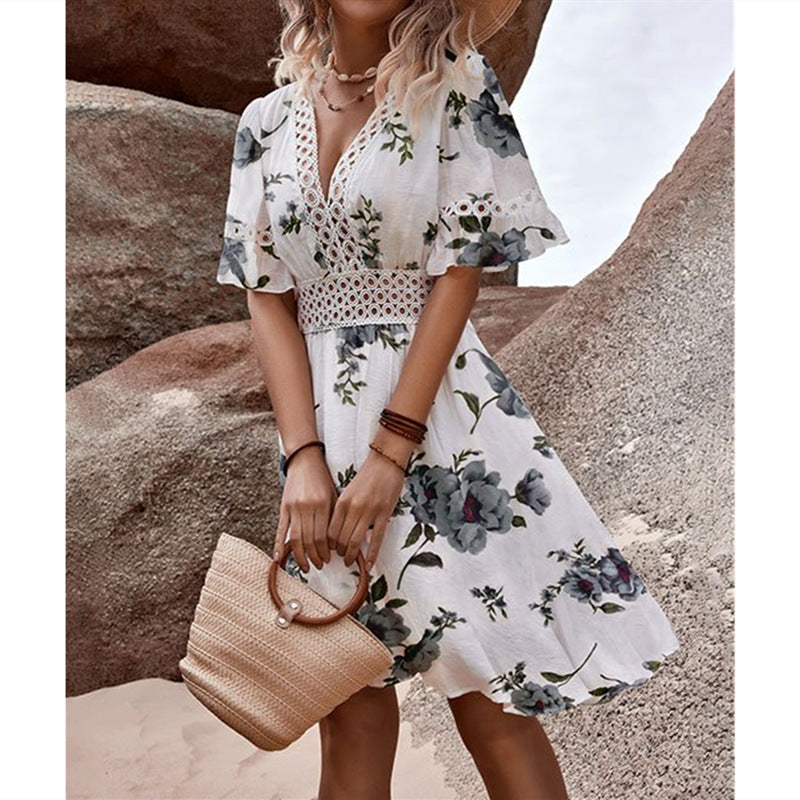 European Look V-neck Printed Lace Stitching Lace Bohemian Casual Vacation Style Dress