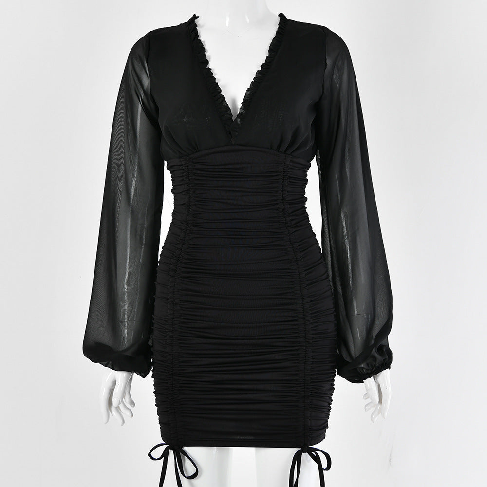 New Deep V Sexy Bodysuit Hip Skirt Bandage Pleated Dress