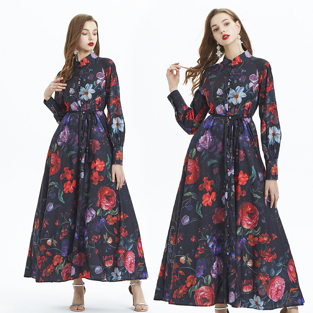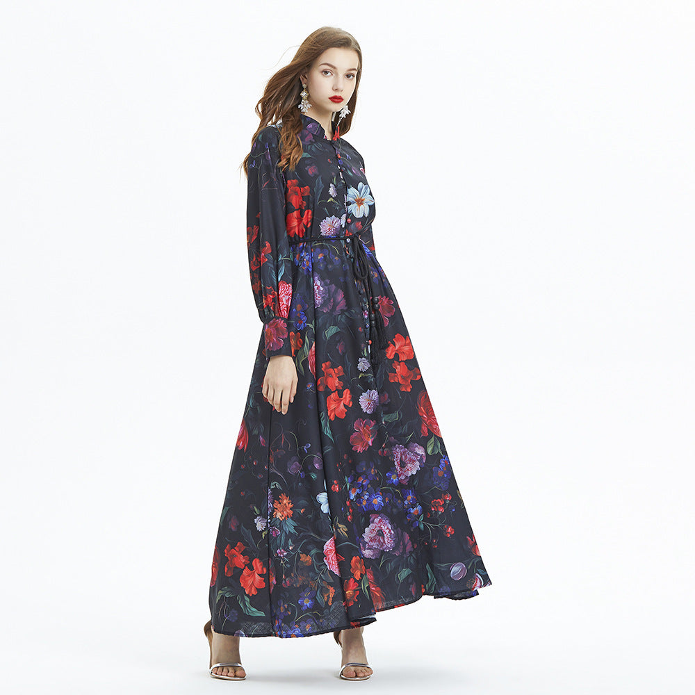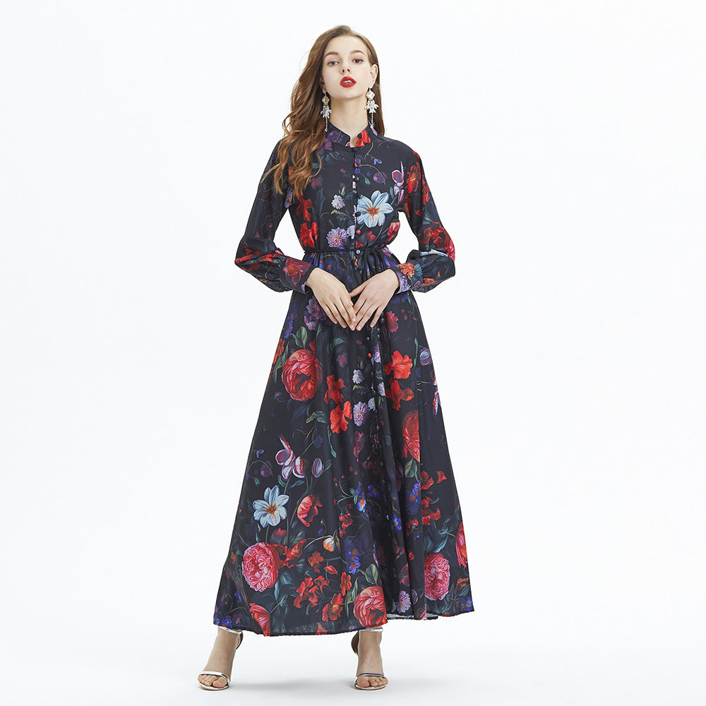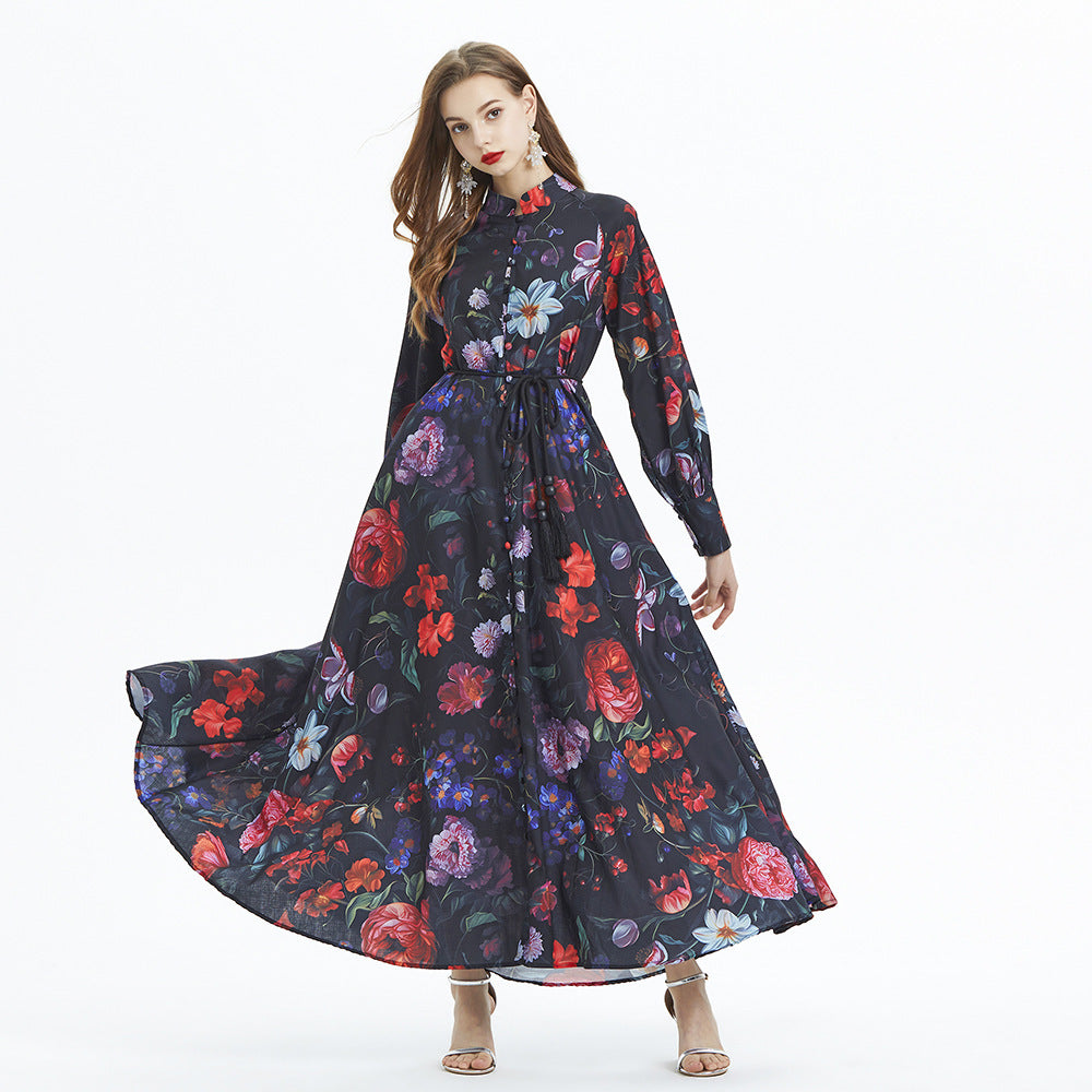 Retro Lantern Sleeve Printing Stand-up Collar Cinched Ruffled Long Dress