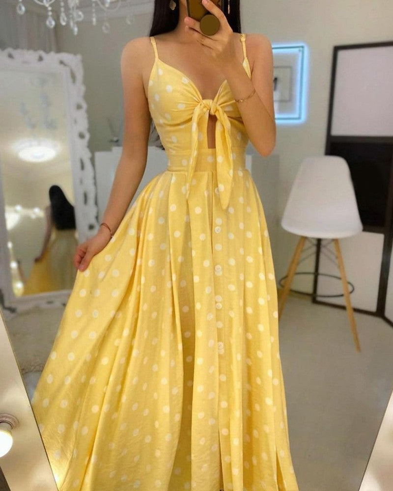 Slingshaped Polkadot Midlength Skirt Highwaist Split Dress
