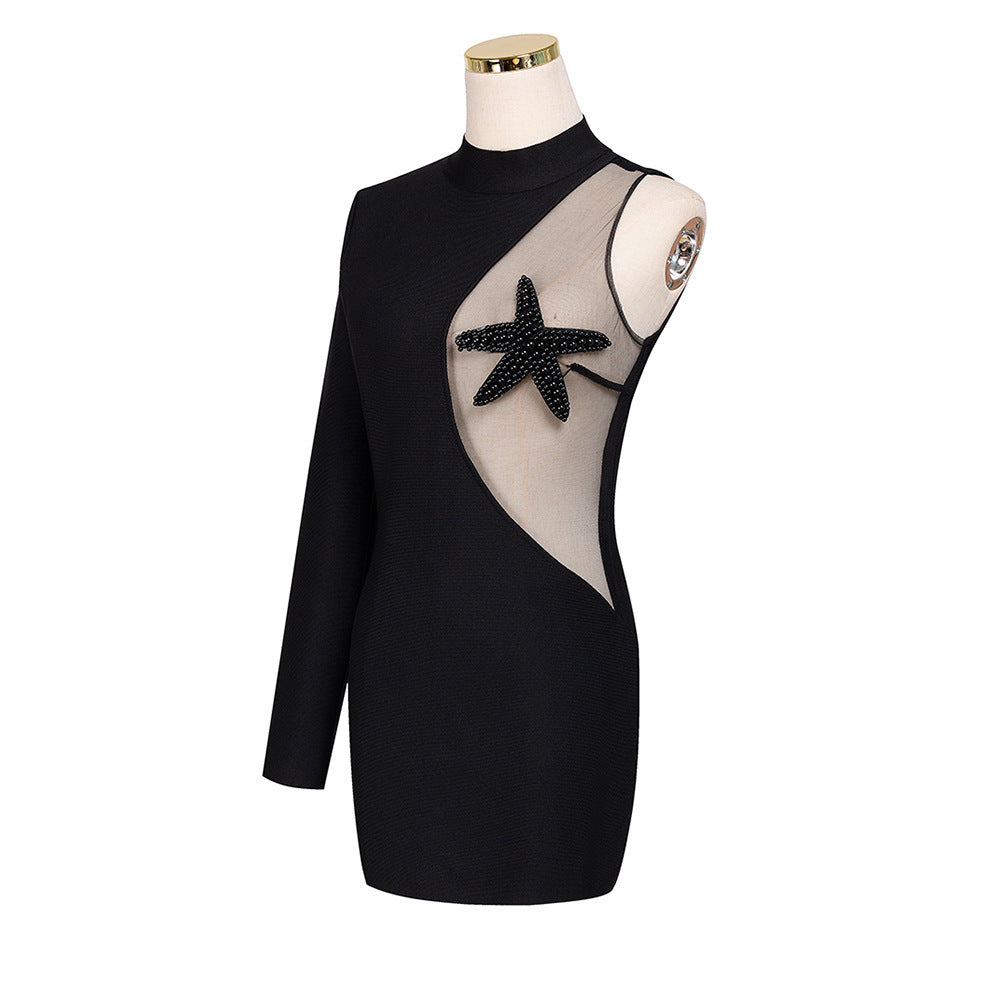 Featuring a single long sleeve, a daring asymmetrical neckline, and shimmering five-pointed star bead embellishments across sheer mesh, this dress captures the perfect balance of sexy and elegant. The high-waist bandage fit sculpts your figure, while the short skirt length adds a playful edge.