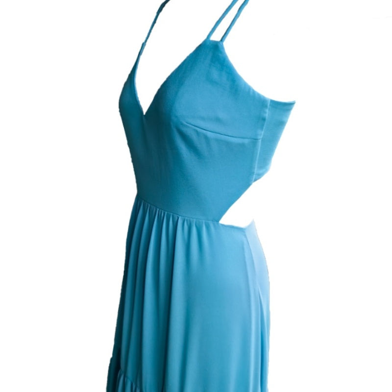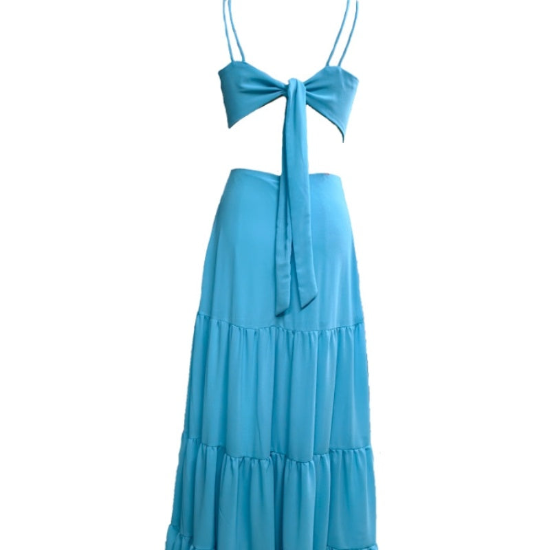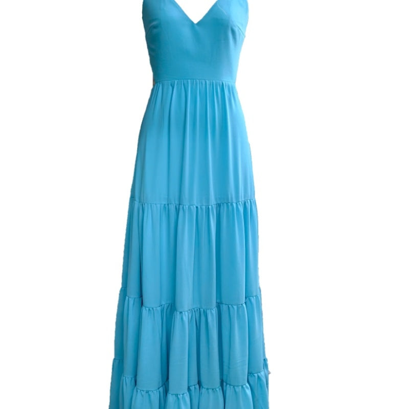 V-neck Solid Color Fashion Lace-up Princess Dress Tiered-Ruffle
