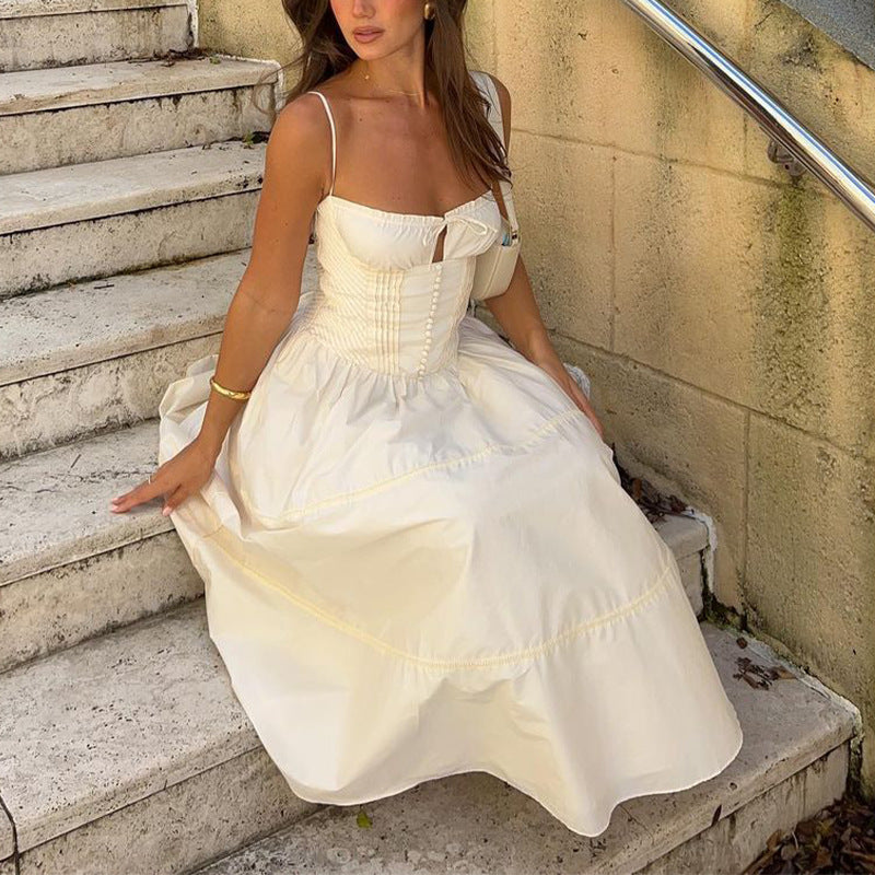 Women's French Suspender Long Dress Button Lace-up Temperament Slim Dress Summer Seaside Vacation Beach Dresses