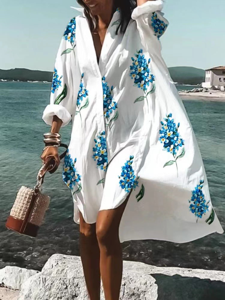 Women's Loose Digital Printing Long-sleeved Lapel Shirt Dress